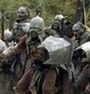 What you see in the film: Gandalf dies, Frodo cries, Gimli bitches about evil elven sorceresses, blah blah blah. But you'll notice that Aragorn has them hauling ass into the forest like it's going out of style. He says that the place'll be crawling with orcs by nightfall. However, as it is still broad daylight, this explanation is not entirely satisfying. Anyhoo, bitch bitch bitch, and here's Haldir and his posse to break it up. (1., 3-4. Decipher: "Loth-lorien Woods," "The Seen and the Un-seen," "You Bring Great Evil"; 2. DVD cap, IGN/Fantasy Planet.) However, we all know that something else was filmed, because it was in the trailer(s). But as you'll see below, the following sequence doesn't mesh easily with the theatrical cut--is it an entirely alternate version, cut for time? 1. Fantasy Planet. This could be orcs roaming towards Amon Hen as the Fel-lowship's on the river. But it looks a lot like the images below... 2. Decipher: "Curse Their Foul Feet." The card text specifically recalls a scene in the books where orcs did pursue the 'Ship into the woods. 3. Fantasy Planet. Picking up the pace. 4-6. Decipher: "Malice," "Goblin Warrior," "Goblin Spear." Notice the similarity of these critters to Decipher's "Relentless" Moria card (at right). But--wasn't the point of Saruman making Uruk-Hai that now he had Orcs who could now go out into the daylight? Yeah, we don't know, either. 7. Decipher: "Goblin Backstabber." (Do what?) Notice how this one's almost the second half of #6. Also note the lovely Venus-flytrap he's sporting here: definitely from the Moria Collection (top right). By contrast, the Uruk-Hai at Amon Hen have different headgear (below right). 8. TORN: Behind the scenes footage from the internet-only preview. 9. TORN: Also from the internet-only preview, which is an interesting connection in itself. Hauling ass makes a lot more sense now, doesn't it? |