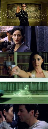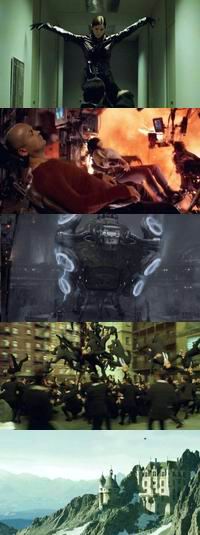 | I hadn't posted a preview page for the Matrix sequels because I felt that the movies were too far along by the time I started doing preview pages; I was more interested in following movies from a much earlier stage in their development. That said, when the final trailer came out yesterday--well, the download is huge, and I know a lot of people won't try to attempt it, much as they might like to, and the Pirates of the Caribbean screen caps went over really well. Thus, we have a special preview/trailer rundown for The Matrix Reloaded. And can I just say something? Capping a Matrix trailer is a thankless job. When you download some of these screen caps, you're going to think they look blurry. Guess what? I was working off the high-res trailer. (The "ultra" was so big, I couldn't even get it to play smoothly on my little computer, much less get it to frame-by-frame.) That's motion blur you're seeing--it was hard as hell to find a clear frame, mostly because everything was whizzing by so fast. Which is another reason you'll want to check these caps out: watching the trailer is a vaguely impressive experience. Actually slowing it down and seeing what's going on will blow your mind. Click each strip of thumbnails for a zip file of about 20 caps (each 640 x 346); there are seven zips total, for 146 stills. |